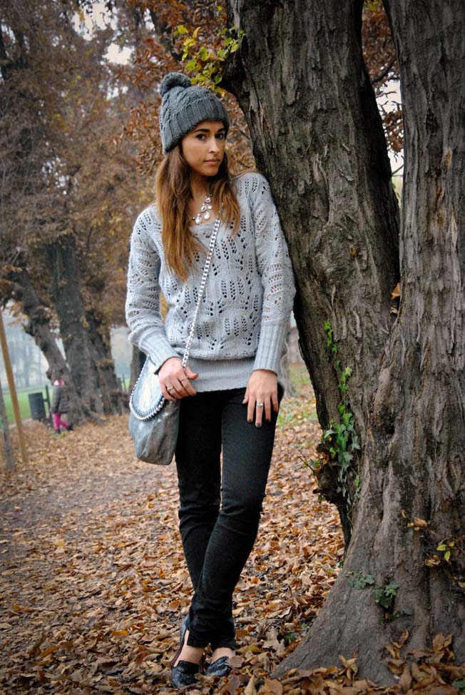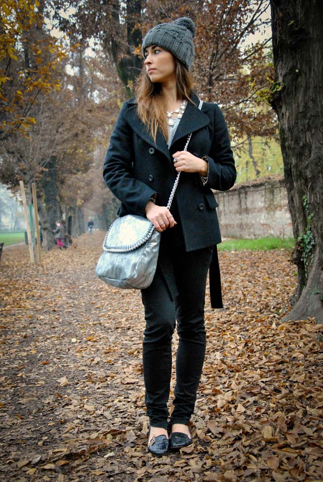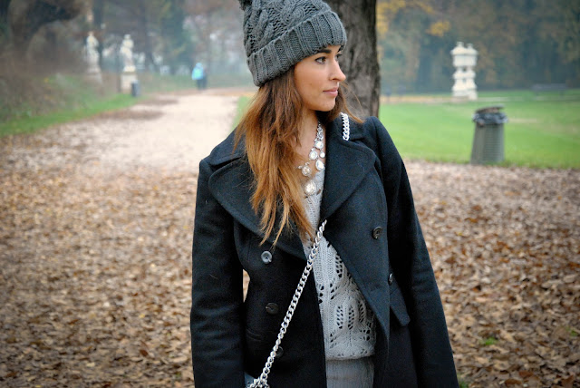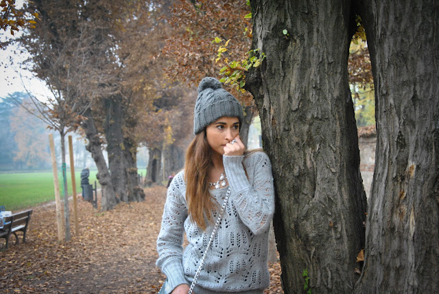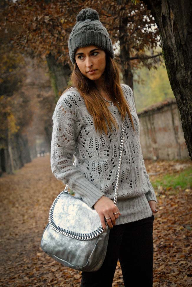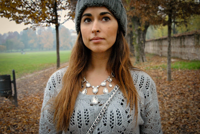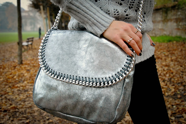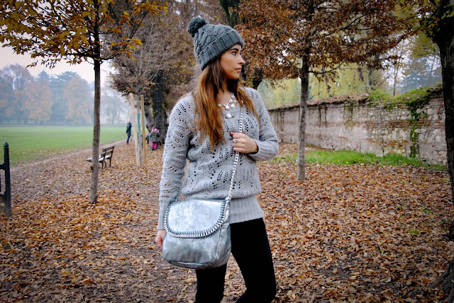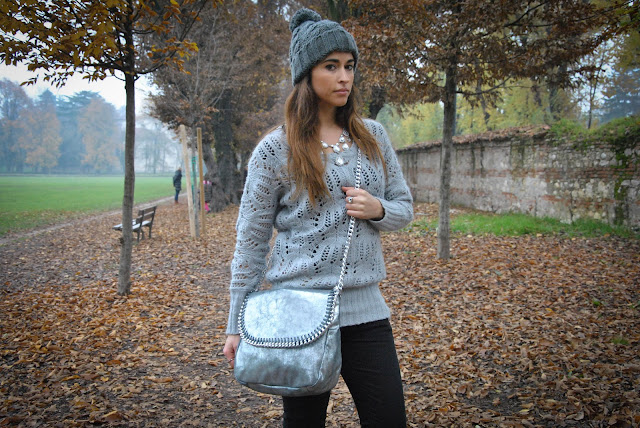 L'unico modo per rendere meno grigio l'autunno è indossare qualcosa di scintillante, come la mia nuovissima L'Aura bag e delle slippers glitterate. Ieri pomeriggio ho fatto due passi per il parco e l'ho trovato il posto perfetto per scattare qualche foto, con e senza cappotto, tanto noi blogger sopportiamo tutte le temperature. Volevo mostrarvi bene la maxi maglia e anche la mia ultima borsa, L'aura nel modello Nina in camoscio glitter argento. Se vi va potete seguire L'aura anche su Facebook e su Twitter. Apprezzo tantissimo questo brand tutto italiano, di una giovane designer che sta ottenendo un gran successo perchè ha realizzato un prodotto molto cool, di grande qualità e ad un prezzo giusto. Per il resto dell'outfit ho scelto di indossare delle slippers, perfette per fare due passi in comodità. Come accessori immancabile il mio anello Tring di Brosway, una maxi collana e il berrettino più trendy del momento, voi ne avete giù uno?