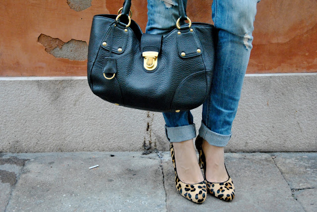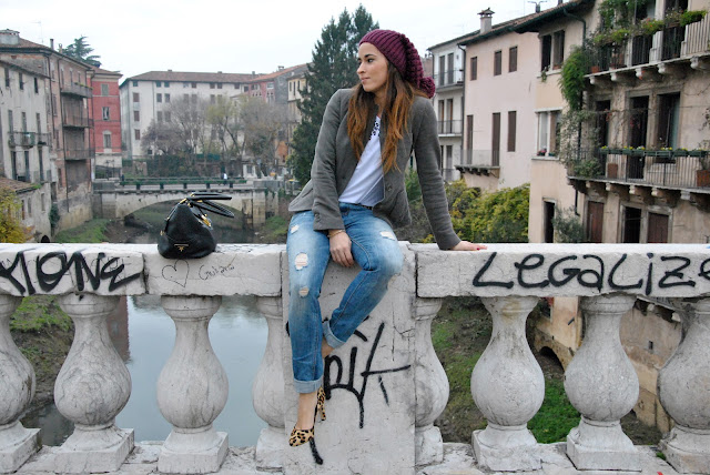 I jeans di questo outfit li adoro, amo lo stile boyfriend e leggermente distressed. I boyfriend jeans sono molto trendy, oltre ad essere comodi e adatti un pò a tutte perchè non fasciano troppo la gamba. Vanno portati così, un pò abbassati, morbidi, con il risvoltino e per renderli più femminili con un bel tacco. Visto che non faceva particolarmente freddo ho indossato un caldo blazer a taglio vivo in jersey di ianux e la tshirt con i teschietti e le rose di Maimadì. Il berretto di lana è una di quelle cose che vedrete spesso sulla mia testa, tanto più che è un must di stagione. Per gli accessori, ho scelto ancora una volta il Tres Jolie di Brosway e una cintura con le borchie piatte.