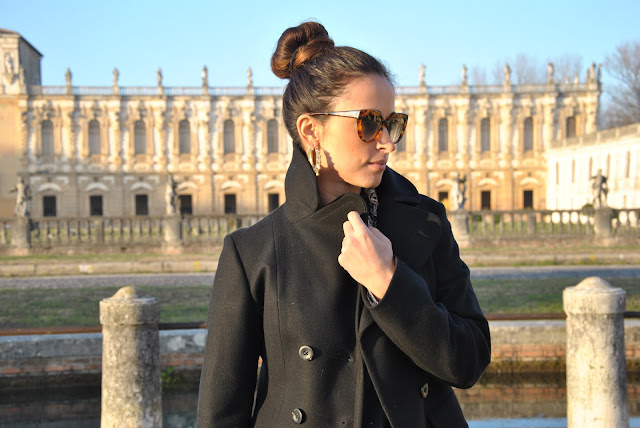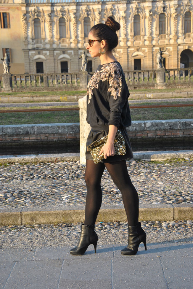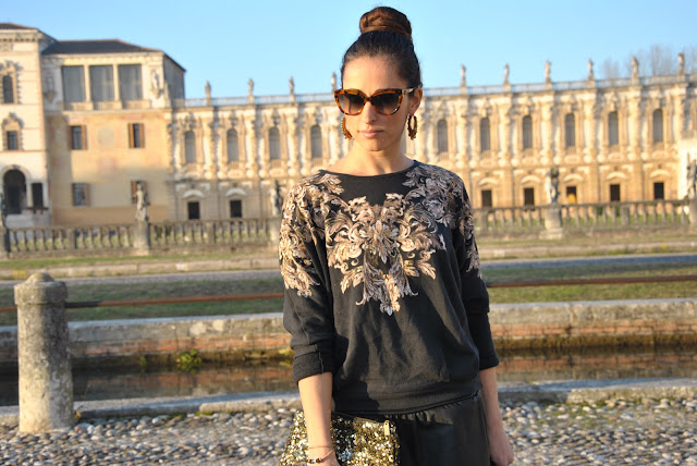 Oggi vi saluto e vi auguro buone feste con un outfit post visto che poi saremo tutti presi con gli ultimi acquisti, festeggiamenti in famiglia o con gli amici. Il mio regalo di Natale è un outfit da poter indossare nei giorni di festa, perfetto per questo periodo dell'anno, dal gusto barocco, scattato proprio di fronte ad una villa che vedete spesso nelle mie foto, ma mai come oggi mi sembrava perfetta come sfondo. Alla nuova gonna in pelle, sì ne ho preso un'altra perchè due è sempre meglio di una, ho abbinato la felpa con i disegni barocchi, che cavalca uno dei trend di stagione. Quest'anno più che mai avrete notato che questi motivi si trovano un pò ovunque, su pantaloni, bomber e maglie come questa. Mi è piaciuta subito perchè nel disegno sono inseriti alcuni dettagli dorati che la rendono ancora più speciale e scintillante. Ad un look così non potevo che abbianare un'acconciatura fai da te, raccogliendo i capelli in un bun, prometto che nei prossimi giorni vi farò il video tutorial di come lo faccio io, avendo tantissimi capelli ho un trucchetto che voglio spiegarvi. Accessori pochissimi per non appesantire: gli occhiali da gatta, le creole e il mio bracciale tres jolie di Brosway. Attendo i vostri pareri.