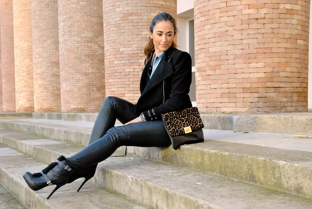 Oggi si riparte, chi torna a scuola, chi al proprio lavoro e alla solita routine e ricomincio così anch'io a postare regolarmente ogni giorno nel mio blog, dopo un pò di pigrizia dettata dai giorni di festa. Inizio la settimana con un nuovo look. Era da un bel pò che volevo acquistare dei pantaloni in (eco) pelle e così alla fine mi sono convinta. Devo dire che sono molto più versatili di quello che credessi, belli sia con i tacchi che con un paio di biker boots o le sneakers. E poi hanno alcuni punti a loro favore: l'effetto sottovuoto e dimagrante, sì perchè se li mettete dopo le feste per più di 8 ore il materiale plasticoso e non traspirante di cui sono fatti vi permetterà di perdere i kg di troppo in un solo pomeriggio. A parte gli scherzi i pantaloni in pelle sono uno di quei capi che se non avete ancora acquistato non potete non avere, magari approfittando dei saldi potreste trovarli ad un ottimo prezzo. Al pantalone in pelle ho abbinato la camicia in jeans con sotto una tshirt e la giacca con i dettagli borchiati. Un outfit un po' aggressivo, grazie anche agli ankle boots, ma il bello della moda è proprio quello di poter essere sempre diversi, semplicemente combiando quello quello che si ha nell'armadio.