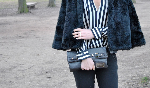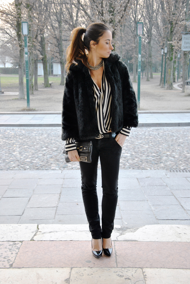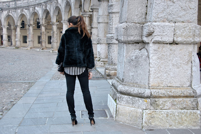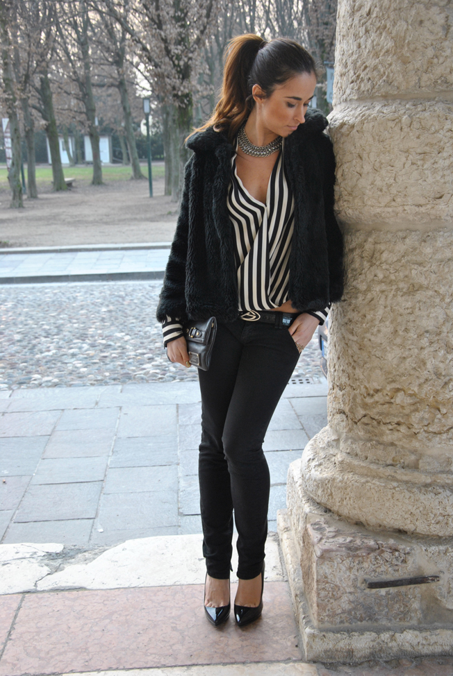 Righe bianche e nere, ce l'ho. E' il trend del momento e ovviamente una camicetta rigata black & white non poteva mancare nel mio armadio. Quando vi ho parlato di righe in molte mi hanno scritto per chiedermi proprio come abbinarle. Personalmente le prediligo su un outfit in cui ci siano solo due colori, anche se qualcuno potrebbe osare abbinandoci dei pantaloni skinny colorati o una gonna sempre colorata, ma non in fantastia. Io ho scelto questo look per una cena. La camicia, pezzo forte di questo outfit, è particolare, più corta davanti e lunga dietro. Oltre ad indossarla con dei pantaloni si presta ad essere portata con una gonna, anche a vita alta. Pochi accessori: la maxi collana e l'anello di Rings & Tings con la croce.