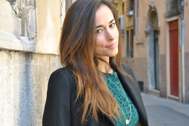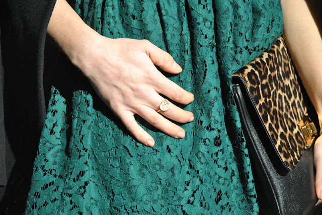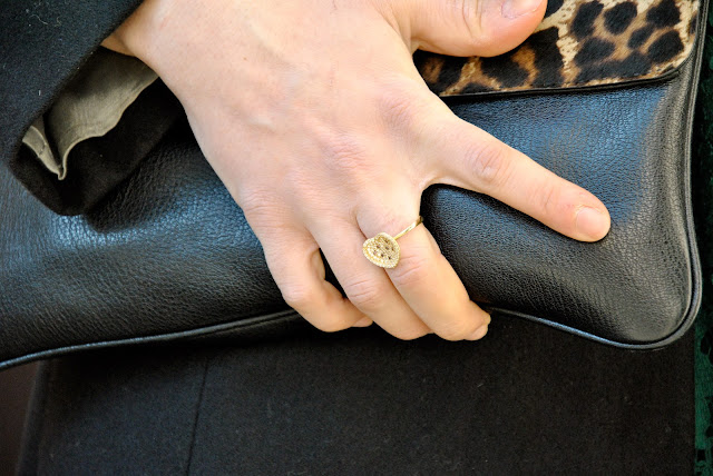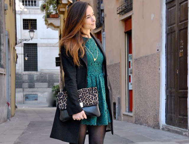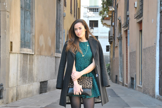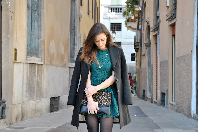 Valentine's Day What shall I wear? Here's my proposal today. Romantino an outfit for a night out with your boyfriend. Since someone asked me for advice, my suggestion is to be romantic, a little etiquette, with a short dress and accessories with many charms in the shape of heart. I wore a dress so that I had already shown here, combined with a very classic coat. For accessories, I could not resist the call of the leopard and I used a leopard clutch with the flap to give a bit of sparkle to the look. On the evening of Valentine's Day I find the perfect jewelry Myrose, fears a yellow gold, very refined, but young, composed of long chain necklace, bracelet and ring with heart-shaped pendants. My proposal therefore aims at an alternate color and a little less trivial to red, emerald green that will be one of the trendiest shades of spring.