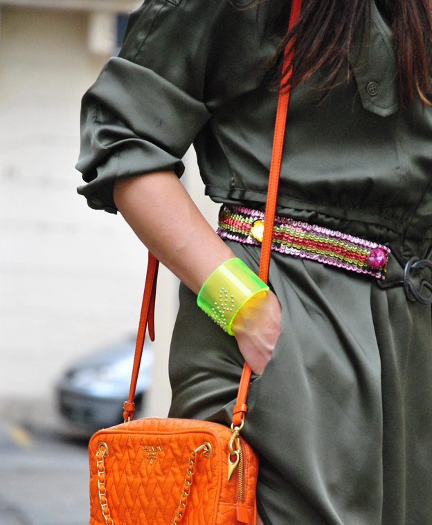 Good morning and good week! Here we are with a new outfit, all played in shades of green that I wore last week to a party at the store DAD. I paired the dress of green silk gold Prada sandals with stones and a green belt Missoni with sequins and colored stones. This belt is my despair because they literally lose the pieces on the street. Since there I could count on his fingers how many times I put it right because the sequins fall off, only fastening it, but it was perfect on this dress. To give an extra touch of color I paired the orange Prada shoulder bag and the bracelet fluo aboutme jewels that had shown HERE. I'm waiting for your opinions, a big kiss.