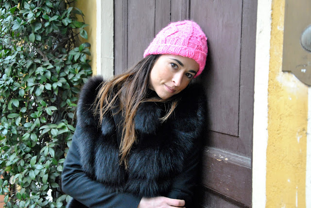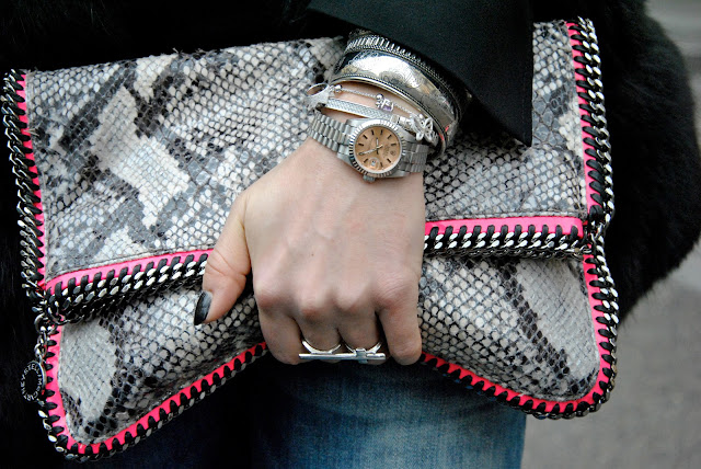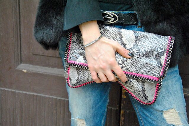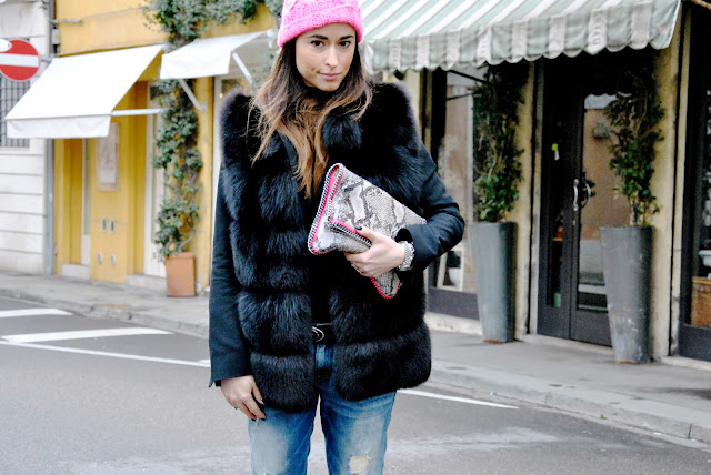 Saturday passed between White and some parade. For yet another busy day in Milan, especially for my feet, I decided to opt for a comfortable look and especially hot. A look that I like a lot and I'm perfectly mirrors. So many times you see me in heels, but for the day I prefer the comfort and today I show you a very trendy to be: a comfortable and ripped jeans, studded sneakers, a black blazer made warmer by a fur vest. The touch of color this time is given by the accessories, a warm hat and fluorescent pink bag McCartney with the profile matching. Many bracelets on my wrist, including the one with the charms of Miluna you had glimpsed on my instagram and the sunrise of Brosway.