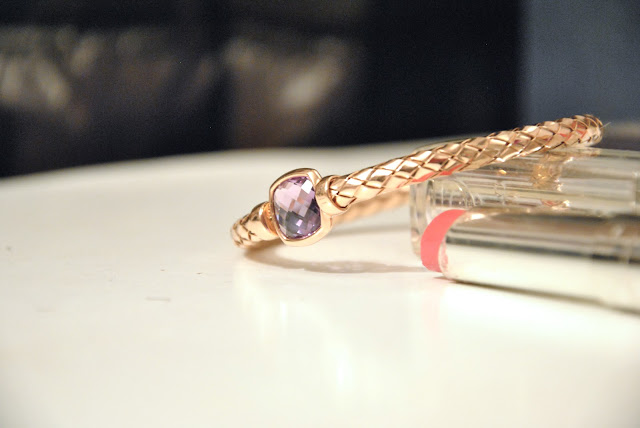 Bene, insomma, dopo aver aspettato la fine della gara ho scoperto di averla vinto. Sì, i miracoli accadono. Sono stata felicissima del risultato e ancora di più quando ho ricevuto il premio, uno splendido bracciale rigido intrecciato in argento, placcato rosè, con una grande ametista viola centrale.