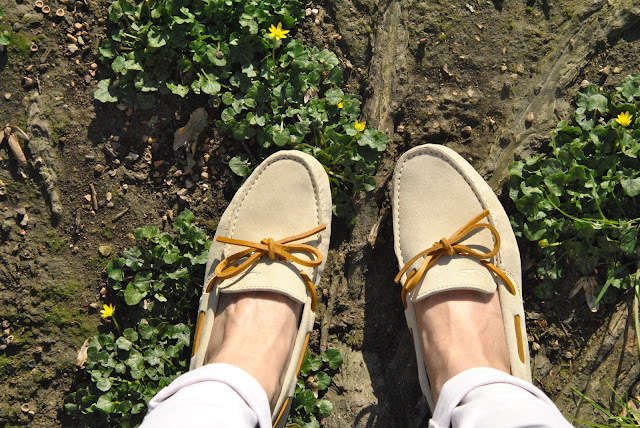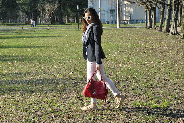 Mi capita di riceve delle mail in cui alcune ragazze mi chiedono consigli su come andare vestite per una determinata occasione, così l'altro giorno quando mi sono guardata allo specchio ho pensato che questo look potrebbe essere l'ideale per un colloquio di lavoro o un esame all'Università. Sotto la giacca blu navy ho abbinato una camicia a righe bianca e blu, dei jeans color crema e dei mocassini nuovissimi, che ho inaugurato con una passeggiata nel parco. Rispetto alle ballerine, che non sono proprio la mia passione, io prediligo un comodo mocassino, questo poi è pure meglio di una pantofola da quanto è morbido, ma anche molto trendy, avete visto che bella la suola? (scusate per il fango!!) E' un pezzo della collezione primavera estate Voile Blanche. Un look molto preppy, completato dalla sciarpina in cashmere leggerissima ma indispensabile in questi giorni di passaggio tra l'inverno e la primavera. L'ho acquistata su Lacrom, non so se conoscete questo portale, ma ve lo consiglio, ci potete trovare tantissimi capi e accessori di designer emergenti esclusivamente italiani. Mi sono innamorata di alcune pochette e sto facendo la conta per decidere quale prendere, sono tutte bellissime. Per questo look invece ho scelto di indossare la mia morbida postina rossa di Zanellato. Per gli accessori non ho caricato troppo l'outfit, ho messo semplicemente il bracciale Miluna con charms della collezione Luna e l'anello Tring di Brosway che per colore era il pezzo mancante di tutto il look.