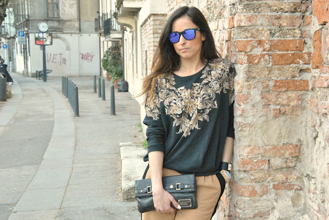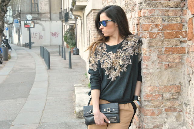 Siete stanchi delle mie lamentele sul tempo? Credo dovrete sopportarmi ancora per un pò visto che hanno previsto un'altra fantastica settimana di pioggia qui da me, per fortuna ogni tanto esce il sole e così sono riuscita a vestirmi in modo più primaverile qualche giorno fa. Vi mostro oggi uno dei miei ultimi acquisti, i pantaloni con la fascia laterale nera. Personalmente a me piacciono molto (nonostante le affermazioni del mio boy che mi ha chiesto se ero in tuta) e credo che acquisterò più capi di questo tipo, li trovo molto eleganti e diversi dai soliti skinny, mi hanno colpito anche per il dettaglio del bottoncino alla caviglia. Vanno portati rigorosamente con i tacchi, altrimenti "l'effetto Aladino" non ve lo leva nessuno. Sui pantaloni ho indossato una felpa dallo stile barocco. Pochi accessori: i miei nuovissimi bracciali di MamiWithLove fatti a mano, delle catene con un intreccio in cuoio. Finalmente riesco anche ad indossare i miei favolosi Oakley Frogskins di cui vi avevo parlato (QUI) qualche giorno fa presi, su Sunglassesshop.com . Che dite, promossa?