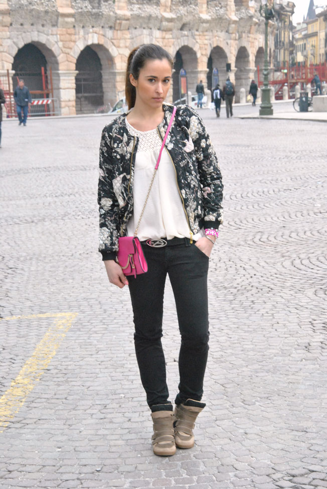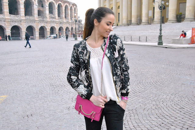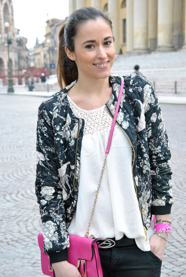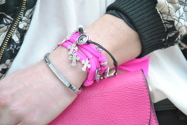 Happy Friday! A new outfit to wish you a good and happy Easter. This is what I wore a few days ago to go to the event Liu Jo that I just told through the pictures in my facebook page and on instagram (find me as @ styleshouts). Since I also did a tour of the city before the event, I got comfortable wearing sneakers with wedge inside. To the above I chose a shirt with a floral decoration and the bomber I had worn another look, but here I'll show it in sportier version, for every day. A gray color these days, more autumn or spring, we think as usual accessories: the clutch of Coccinelle and the Coo Cool bracelet. Thanks to the blog in the last year I came into contact with many young projects, like this one from Francesca, a twenty year old designer of Brescia. Her bracelets are colorful and original, go see them on his Facebook page.