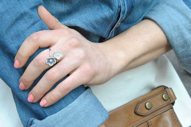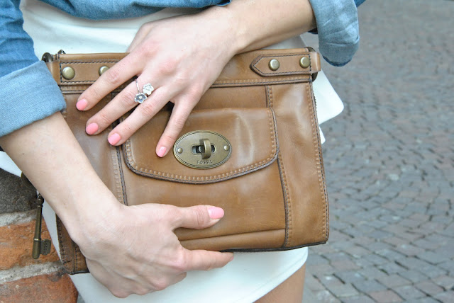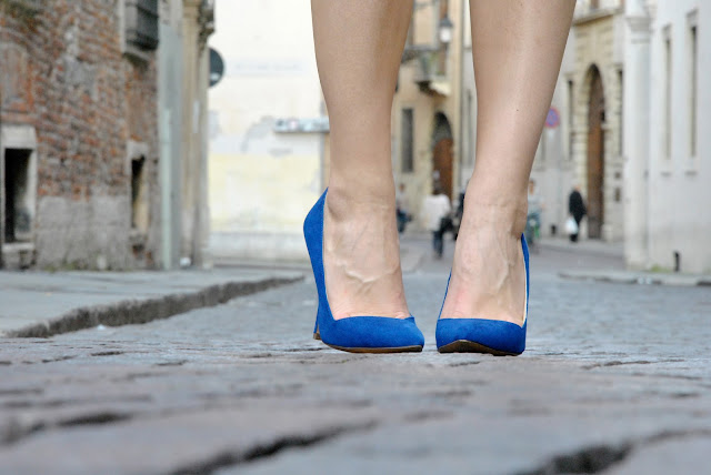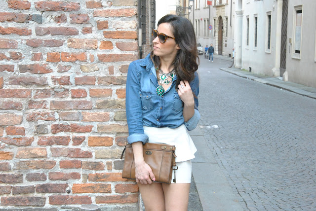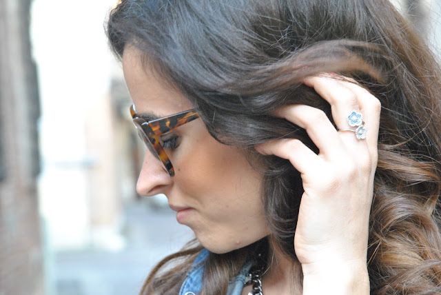Finalmente il caldo è arrivato, non vedevo l'ora di togliere i pantaloni ed infilarmi una delle mie gonne nuove. A quanto pare il peplo continuerà a decorare le nostre gonne durante la prossima estate. Personalmente ho una passione per quelle corte, forse ve ne eravate già accorti, ma le preferisco di gran lunga alle maxi skirt che, anche se vanno di gran moda, non riesco proprio a vedermi addosso. Un look molto femminile e facile da indossare. Pure per le camicie in jeans ho una vera passione e questa è una delle mie new entry, ormai ne ho una collezione, questa più scura delle altre mi piaceva particolarmente indossata con le decolletè blu elettrico. Per gli accessori ho scelto una maxi collana per illuminare la scollatura e un anello che adoro di Myrose della collezione FIORI in oro bianco, con tanti piccolissimi cristalli bianchi e blu. Spero vi piaccia, aspetto i vostri pareri!!