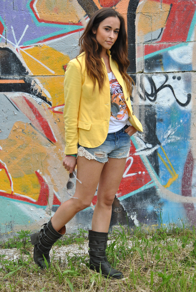 Colore, io ho bisogno di colore e anche se il tempo dalle mie parti non si era mai visto così grigio, io mi faccio tornare il buon umore indossando una giacca che più energia di così non può trasmettere. Inizio una nuova settimana con un look molto easy, con degli shorts che adoro e non vedevo l'ora di indossare, con dei dettagli macramè. Li ho abbinati ad una giacca in felpa IANUX dal colore sgargiante e ad una tee di JCOLOR. Questa tshirt è nuova nuova e mi piace già un sacco perchè segue un pò il trend di stagione delle maglie con le stampe di bestie feroci, io ho scelto quella dal colore aztec, ma l'avevo vista anche in altre varianti. Per gli accessori ho messo un altro paio di occhiali da sole che ho da una settimana, di un marchio che ormai conoscete visto che ne avevo già un paio lo scorso anno, si tratta dei Pollipò, un brand italianissimo. Al mio polso porto anche i simpaticissimi bracciali BRIKINI in gomma colorata e morbida, con un charms a forma di omino stilizzato, io li trovo divertenti e adatti a questo look che non vuole prendersi troppo sul serio.