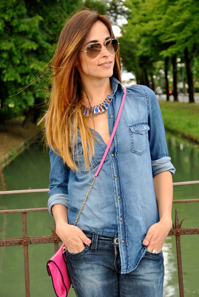 Un abbinamento che a me piace proprio, un jeans e la camicia dello stesso tessuto ma non dello stesso lavaggio, perchè bastano due capi basici e un elemento di rottura come una clutch coloratissima per creare un look. Vi mostro in questo outfit dei sandali che già mi fanno impazzire, li metterei sempre ai piedi, intanto perchè sono super comodi e poi perchè li trovo molto sensuali, con la cinghietta alla caviglia. Già prevedo che saranno i miei preferiti quest'estate. Oggi vi mostro anche il risultato ottenuto grazie a Mauro I Parrucchieri sui miei capelli alla luce del sole, io li adoro. Per gli accessori ho ripreso i colori del jeans con il tring di Brosway, se mi seguite su Facebook o Instagram avrete visto che sono passata in fiera a Vicenza Oro a sbriciare tra le novità e ho già addocchiato i nuovissimi tring estivi, con le pietre quadrate. Per non lasciare la scollatura vuota ho unito un collier di Ottaviani che si sposa perfettamente col resto dell'outfit. Come sempre attendo le vostre opinioni!