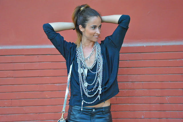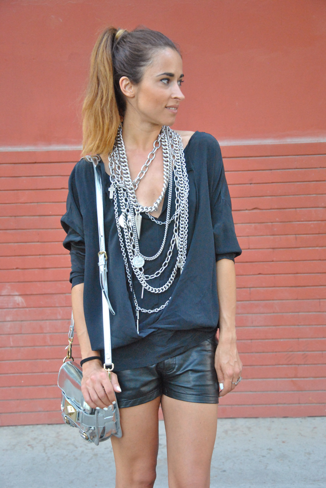 Oggi vi mostro il mio outfit per il party di LuisaViaRoma di qualche giorno fa a Firenze. Sono riuscita a raccontarvi l'evento attraverso facebook e instagram, ma per il resto zero foto, incredibile ma vero eppure è così. La festa era ambientata nel giardino di Boboli a Firenze, in una cornice molto suggestiva ma anche molto scura per la mia reflex. I veri fotografi che si aggiravano per il parco avevano dei fari per riuscire a fare qualche foto, figuratevi io, quindi ho lasciato da parte l'idea e mi sono goduta la festa coi miei amici toscani e le mie amiche blogger che finalmente ho rivisto dopo tanti mesi. Per il look che doveva essere a tema Grunge Glam ho optato per un total look nero, con shorts in pelle e camicia morbida. A fare l'intero outfit è la collana a più fili, un piccolo prestito da parte della Maison Franco Pianegonda che per l'occasione mi ha concesso l'onore di indossare un pezzo Pianegonda vintage che qualche anno fa era stato creato e indossato anche da Laura Pausini in uno dei suoi video. Una collana multi catene, di diverse dimensioni, forme e lunghezze, con i charms tipici della Maison Franco Pianegonda, ovviamente in argento. Io me ne sono innamorata appena l'ho vista, anche perchè era proprio quello che cercavo. Per completare il look una borsa a spalla silver.