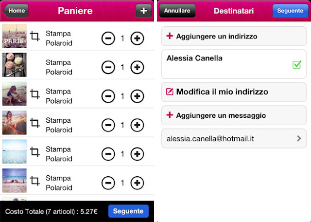 Quante foto avete scattato durante le vacanze? Sicuramente un'infinità, come me. Se escludiamo quelle fatte con la reflex il mio cellulare sta scoppiando, non so voi. Ho provato così un'App molto carina POLAGRAM che vi consente di selezionare delle foto dal vostro telefono, inviarle velocemente e riceverle a casa nel giro di pochissimi giorni. Ho provato per voi Polagram, perchè mi piaceva l'idea di poterle toccare queste foto e magari appenderle in camera da qualche parte e visto che sono un'appassionata di Instagram, ho deciso anche di farle stampare nel vecchio formato delle Polaroid. Molte di voi magari non hanno mai visto una Polaroid, ma io che sono nata negli anni 80 ne ho una bella collezione!! Ad ogni modo vi consiglio questa App , tutte le vostre foto vi arriveranno a casa, dentro ad una bella busta fucsia e saranno pronte per essere appese o messe e riguardate durante l'inverno, per ripensare a questa favolosa estate.