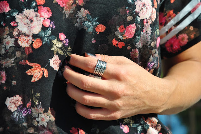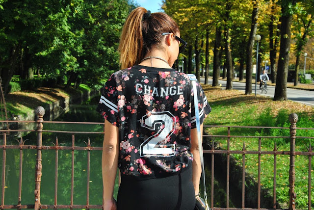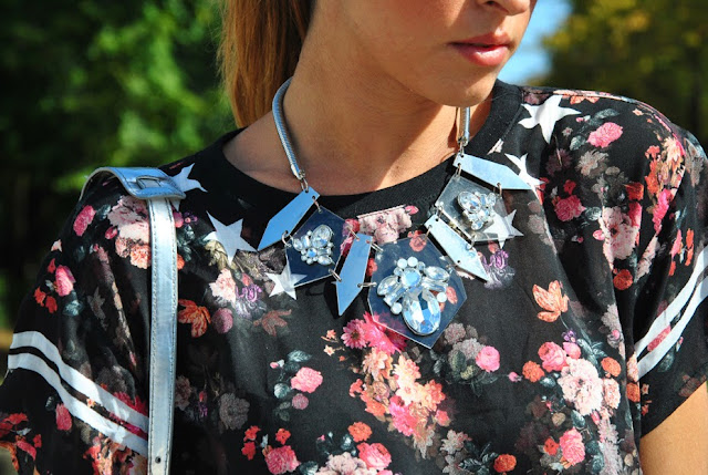 Ancora un fine settimana di sole, ancora tanta voglia di lasciare le gambe scoperte. Così senza pensarci tanto lo scorso sabato mi sono fatta due passi con questo outfit, anche se poi ho dovuto infilare una giacca appena è calato il sole, prima di rischiare l'ibernazione. Non vedevo l'ora di mettere i miei nuovi boots spuntati e mostrarveli!! Io il freddo non lo temo e quindi li porterò anche più avanti con i jeans, ma quando li ho visti ho avuto un colpo di fulmine, io li adoro!! Per il look indosso una mini a vita altissima, e una maglia che cavalca ancora il trend delle maglie col numero, già esploso la scorsa estate, ma ora con un tocco più femminile, grazie alla stampa floreale. Per gli accessori ho optato per una collana in plexiglass che ho acquistato a New York, il mio anello luccicante di Brosway della collezione Falling Stars. Un nuovo look anche per il mio telefono, con una bella cover glitterata che potete trovare su Benjamins.