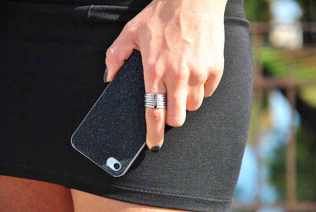 Even a weekend of sun, still want to leave bare legs . So without thinking so much last Saturday I got to walk with this outfit , even if I had to put a jacket as soon as the sun was down , before risking hibernation. I could not wait to put my new boots sprung up and show them to you ! I do not fear the cold and then bring them even further ahead with jeans, but when I saw them I had a stroke of lightning , I love them ! For the look I wear a mini -lived high , and a shirt that still rides the trend with the number of meshes , already exploded last summer, but now with a more feminine touch thanks to the floral print. For accessories, I opted for a series of plexiglass that I bought in New York, my ring sparkling with Brosway collection of Falling Stars . A new look for my phone, with a beautiful glittery cover that you can find on Benjamins .
