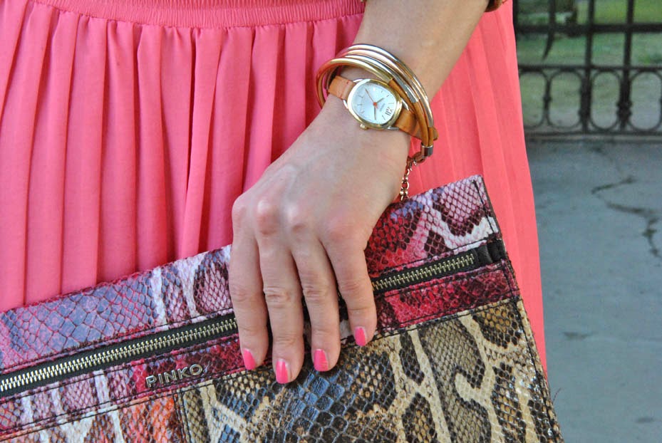 Iniziano le cerimonie e i dubbi colossali sul "cosa mi metto?" . Qualche giorno fa sono stata al battesimo del bimbo di una mia cara amica e per l'evento ho scelto un abito lungo color rosa. Mi sono innamorata appena l'ho visto. Questo abito lungo e plissettato è una vera delizia. Non porto moltissimo gli abiti lunghi perchè li trovo impegnativi, ma in questo caso l'ho visto perfetto per il tipo di evento a cui dovevo partecipare. Leggero e svolazzante, un piccolo capolavoro di Patrizia Pepe , acquistato, come tutto questo look da Sorelle Ramonda, ma ho visto che lo potete trovare anche on line nel loro shop ( QUI ) . Per completare il look ho messo un giacchino in pelle con inserti in cotone e la borsa a busta con stampa pitonata, perfettamente abbinata ai colori dell'abito di Pinko che trovate sempre on line QUI e QUI . A me piace moltissimo questo outfit, voi cosa ne pensate?