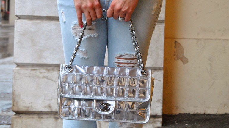 Due parole al volo per raccontarvi questo outfit scattato ieri tra un acquazzone e l'altro. Scusate la qualità delle foto ma c'era proprio poca luce , ma ci tenevo a mostrarvi questo look in cui indosso una felpa carinissima e divertente di Mauro Grifoni in neoprene. Un outfit per tutti i giorni o il tempo libero, al quale ho unito un denim strappato con un lavaggio chiaro e delle scarpe sportive, perchè ultimamente questo stile mi piace molto. Pochi dettagli preziosi, come la Chanel Ice cube che finalmente vi mostro per bene, l'ho presa da Mama Sottomarina , non è stupenda ? Si tratta di una riedizione della mitica 2.55 fatta da Chanel nel 2005 .