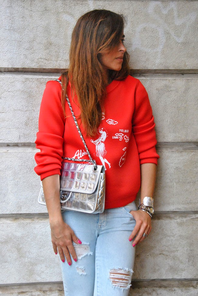 Two words to tell you this outfit shot yesterday between a shower and another. Sorry for the quality of the photos but there was just a little light, but I wanted to show you this look when wearing a sweatshirt cute and funny Mauro Grifoni neoprene. An outfit for every day or free time, which I joined a ripped denim with a light wash and sports shoes, because lately I really like this style. Few fine details, such as the Chanel Ice cube that finally I show you right, I got it from Mama Submarine, it is not wonderful? This is a reissue of the legendary 2:55 made by Chanel in 2005.