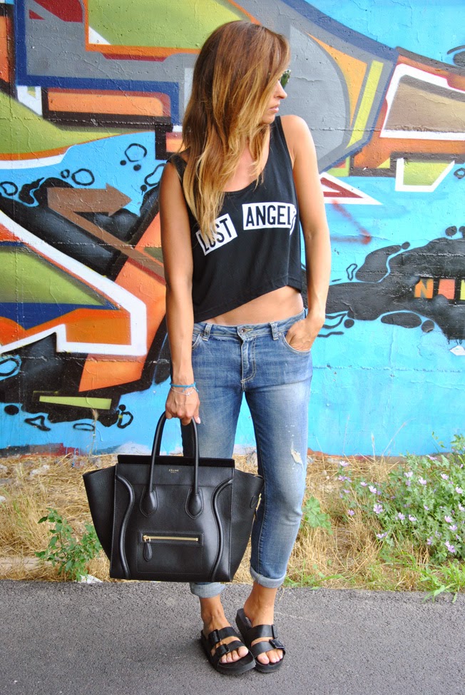 Non vorrei abituarvi troppo agli abiti lunghi, anche se questo fine settimana me ne vedrete indossare parecchi visto che sarò inviata per Ethos Profumerie alla Mostra del Cinema di Venezia, ma alla fine, tutti i giorni sono più così: denim strappato, un crop top e una maxi bag. Punto della discordia saranno sicuramente le scarpe che indosso, le Birkenstock. O le ami o le odi. Dopo un'iniziale titubanza ho deciso che per me era amore. Pochi altri accessori, tra cui i miei bracciali con l'ancora e in argento di Brosway per continuare a portare con me un pò di mare e di vacanze.