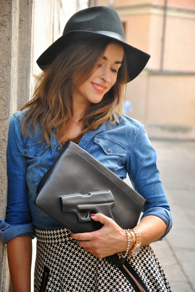 Capitolo cappelli: bhe, dopo le ultime vicende credo diventeranno il mio vero feticcio, anche perchè un semplice cappello è in grado di dare quel tocco di particolarità ad ogni look. A me sono sempre piaciuti, ma in questo ultimo periodo particolarmente. A completare l'outfit la scarpa spuntata e la clutch con la pistola di Jessica Buurman. Ho aggiunto un pò di colore grazie al rossetto arancione che non metto quasi mai, ma in questo contesto ci stava, perchè è l'unica nota colorata tra tanti neri.