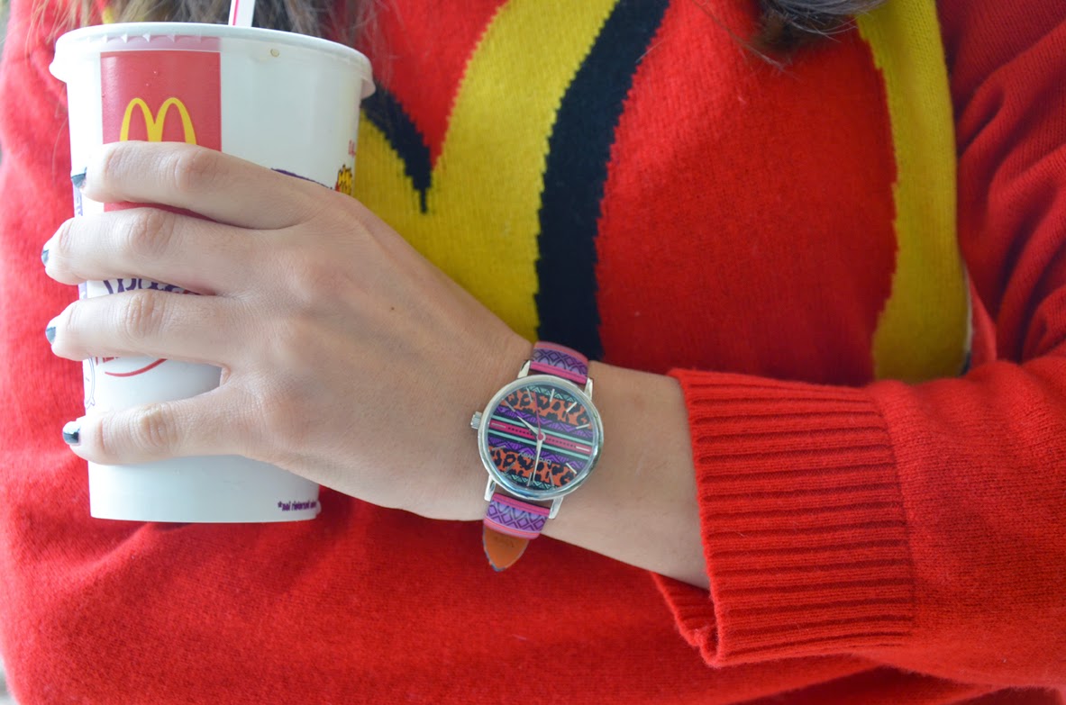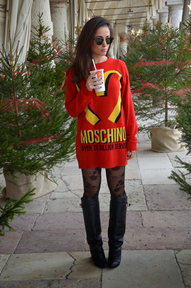 Jeremy Scott non è nuovo a questo genere di cose, da sempre realizza collezioni che diventano una sorta di parodia di loghi, slogan e simboli dell'America way of life. Debutta proprio per l'autunno inverno con una sfilata tutta dedicata a Mc Donald's , al mass market e al cartone animato SpongeBob . Borse, maglie e cover super pop e divertenti. Per il mio outfit di oggi ho scelto proprio una maxi maglia di questa collezione che ho indossato come un abito.