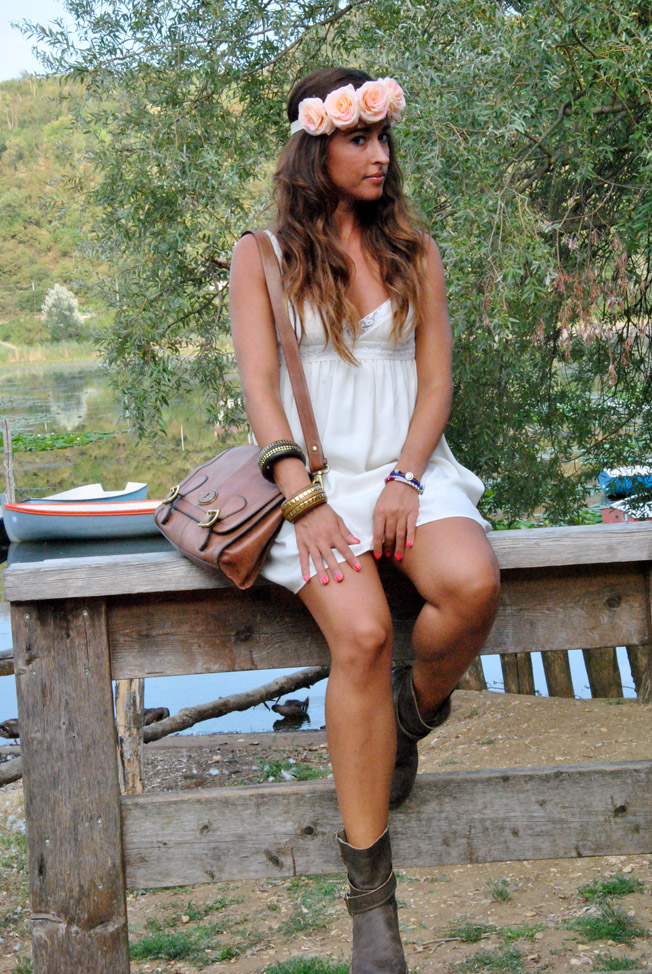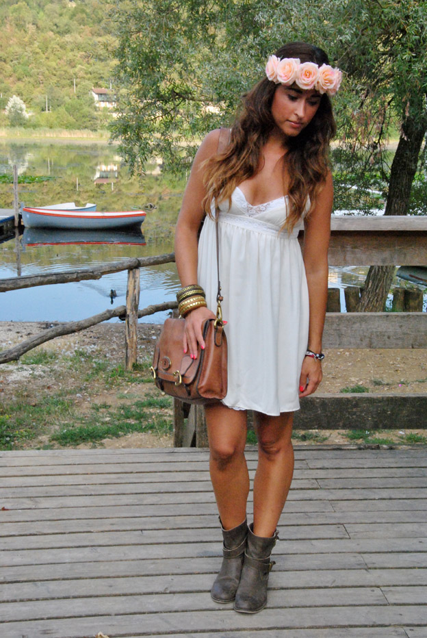 Come promesso ecco un nuovo outfit, per mostrarvi una borsa che ultimamente adoro e uso spesso nel tempo libero, la mia postina di Fossil. Di borse postina style ne avrete viste sicuramente tantissime in giro, di diverse dimensioni, materiali, con la chiusura a gancio o con due cinghiette a fibbia, che in realtà nascondo sotto una calamita per aprirla e chiuderla più velocemente. La postina è una borsa da giorno molto pratica, grande, utile anche per chi studia, visto che è anche molto capiente. Ce ne sono anche alcuni modelli più piccoli, ne ho viste alcune fluo di altri brand, da poter portare anche la sera, magari con un total look black. Io ho scelto di indossarla con questo outfit molto informale, con un abito dai dettagli in pizzo e i biker boots alla caviglia. Unico vezzo la corona di fiori sulla mia testa. Dai, non sono impazzita, in realtà morivo dalla voglia di metterla questa corona e vista l'ambientazione delle foto mi sembrava perfetta. In realtà l'ho usata solo una sera per una festa a tema anni 70.