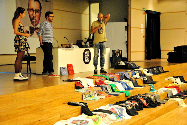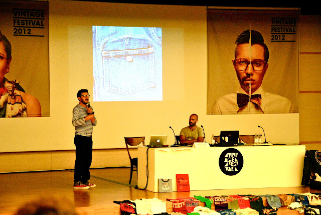 Andrea Rosso, direttore creativo di 55DSL e Angelo Caroli di A.N.G.E.L.O. insieme per uno workshop su Vintage, Old School e grafica, così si è aperto per me il Vintage Festival di Padova. Tre giorni di all'insegna del Vintage, esposizioni, workshop, mostra-mercato e party che hanno coinvolto tutta la città di Padova. In un'ora Andrea e Angelo hanno cercato di spiegare come la storia della moda possa essere racconta anche attraverso delle stampe su delle tshirt o osservando dei jeans e come questi influenzino ancora il lifestyle contemporaneo. Nella collezione personale di Andrea Rosso è stato bello rivedere alcune stampe che fanno parte dei ricordi della mia infanzia o che fanno parte dell'immaginario collettivo, come quella celebre della bocca con la lingua degli Aerosmith. Una tshirt non è solo un capo di abbigliamento, ma crea un legame indissolubile tra moda, comunicazione e storia. Angelo invece, illustrando l'evoluzione del jeans , mi ha fatto scoprire come alcune caratteristiche dei pantaloni che tutti i giorni indosso, in realtà abbiano delle origini e motivazioni lontane, come l'uso dei rivetti sulle tasche, adottati nell'800 dai minatori per essere più robuste e poter contenere delle pepite d'oro. E' stata sicuramente un'esperienza stimolante e positiva.