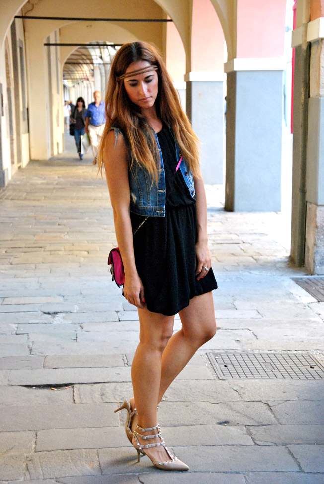 As promised here is the outfit worn on the Padova Vintage Festival. How can we not take the opportunity for a different look? The bands at the top you realize that I like, but every time I put them there is always someone (my boy or my friends) who are laughing behind me, so I make it take off. Finally on Friday I could wear it without me so many problems. We come to look. A little black dress should never miss in your wardrobe because it is extremely versatile. In this case it is enough to add it to a gillet in jeans with studded details, a shoulder bag and not very high-heeled shoes to make informal taste a bit 'grounge. After months I put my beloved Valentino Rockstud, which on summer days I had left in the bottom of the shoe. They are without a doubt one of my favorite shoes ever. I've seen and also spotted in black paint, I was getting a shot, but I think that if I do not want to sell a kidney for a long time 'will remain just a wish. Only jewelry that I chose to wear my Brosway of Tring. I look forward to your opinions on this outfit.
