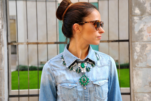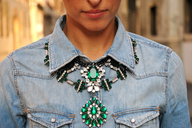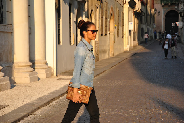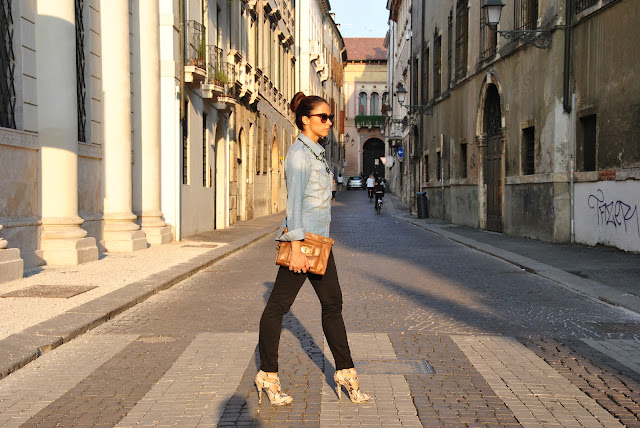 Recently I like mixing colors, fabrics and prints, because I find that the result is less obvious and striking. Nell'outfit today I could wear shoes and bag simple or the same color, however I actually thought that a shoe python would marry perfectly with my brand new clutch Fossil. The backdrop to this outfit my city, Vicenza that this weekend was literally invaded by tourists, thanks to the reopening of the Palladian Basilica and the exhibition 'Picasso to Raphael' that I can not wait to visit me too. Returning outfit on the denim shirt I wore a maxi necklace with green stones. The clutch is married perfectly with my look a male, in contrast with the shoes a bit 'aggressive, but very female. For the hair I chose a crop, creating a bun alone, hope you like the set!